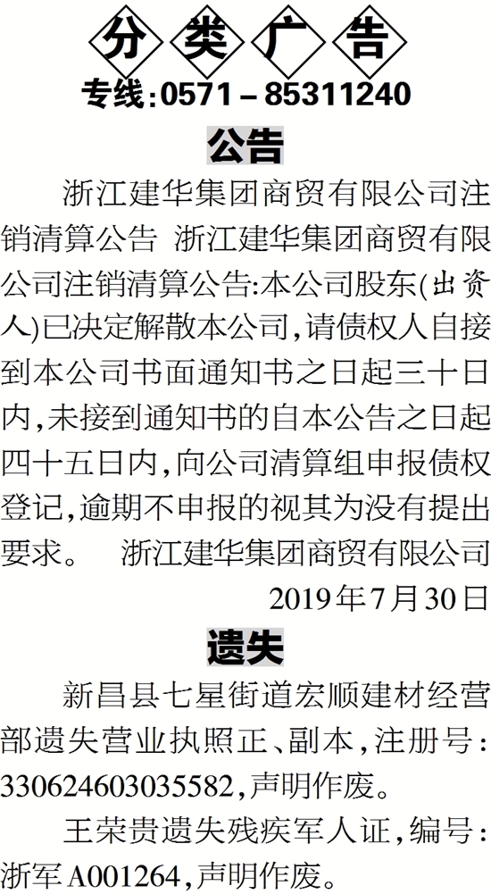 浙江建华集团商贸有限公司注销清算公告 浙江建华集团商贸有限公司注销清算公告:本公司股东(出资人)已决定解散本公司,请债权人自接到本公司书面通知书之日起三十日内,未接到通知书的自本公告之日起四十五日内,向公司清算组申报债权登记,逾期不申报的视其为没有提出要求。 浙江建华集团商贸有限公司