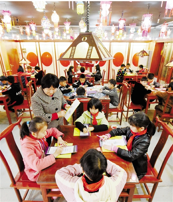 11月27日,在台州市仙居县皤滩乡中心小学花灯工作室,非遗传承人方荷玉向学生传授针刺无骨花灯制作技艺。 拍友 王华斌 摄