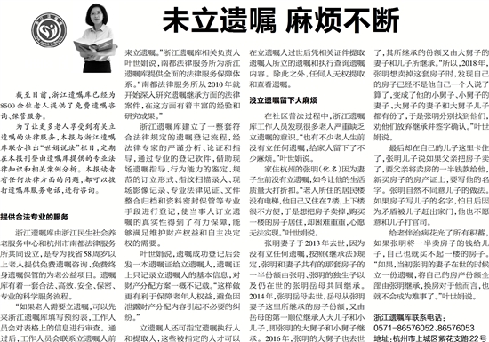 为了让更多老人享受到有关立遗嘱的法律服务,本报与浙江遗嘱库联合推出“世娟说法”栏目,定期在本报刊登由遗嘱库提供的专业法律知识和相关案例分析。本报读者有任何法律方面的问题,都可以拨打遗嘱库服务电话,进行咨询。