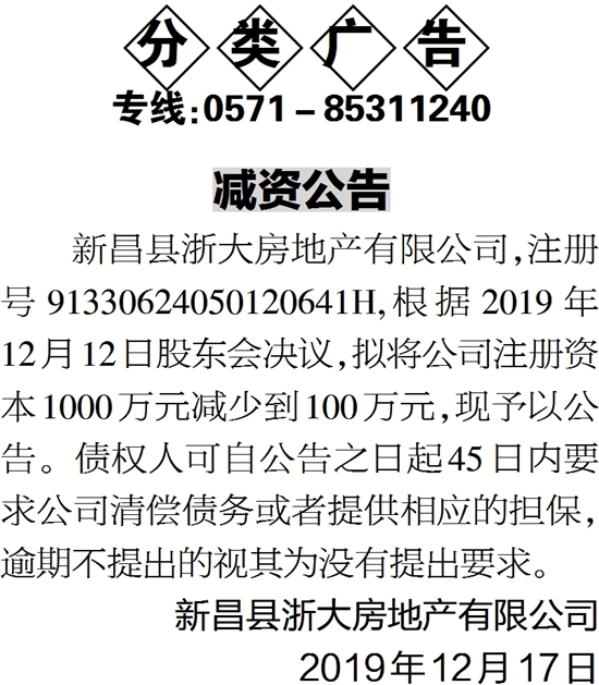 新昌县浙大房地产有限公司,注册号91330624050120641H,根据2019年12月12日股东会决议,拟将公司注册资本1000万元减少到100万元,现予以公告。债权人可自公告之日起45日内要求公司清偿债务或者提供相应的担保,逾期不提出的视其为没有提出要求。