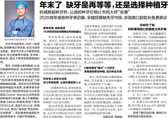 你缺牙了吗?你在佩戴假牙吗?你想种牙吗?为造福杭城缺失牙市民,本报特为市民开通绿色通道,为缺失牙患者带来真正实惠有力的援助。目前,由杭州西湖口腔医院举办的“2020跨年感恩种牙季活动”公益援助也在同时进行中。