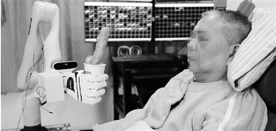 张大伯用“意念”吃油条。图片由浙大二院提供