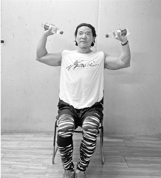 坐在椅子或凳子上,左右手各拿一瓶矿泉水,上身保持挺直状态,同时把双手向上举至肩的两侧,向上举起,然后还原,同样的动作连续做25次为一组。