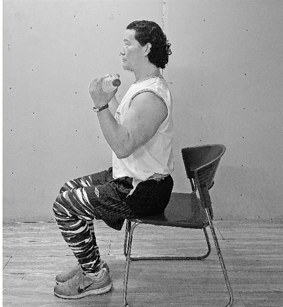 坐在椅子或凳子上,左右手各拿一瓶矿泉水放在椅子两侧,上臂保持不动,双手慢慢向上弯举,上举时上身保持不动然后还原,该动作连续做15次。