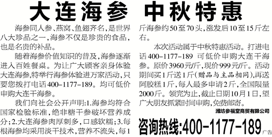 本次活动属于中秋特惠活动。打进电话400-1177-189 可低价申购大连干海参。原价3960元/斤,现价999元/斤。活动期间买1斤送1斤(赠品与主品相同),再送阿胶糕1斤,每人最多申请2斤,全国限量2000斤。领完为止,截止日期10月1日,望广大朋友抓紧时间申购,免费邮寄。