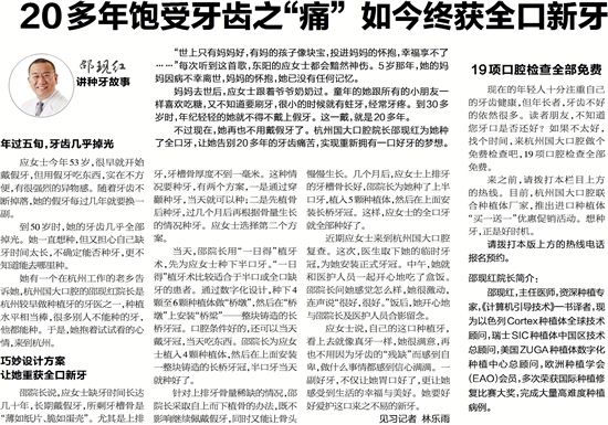 她有一个在杭州工作的老乡告诉她,杭州国大口腔的邵现红院长是杭州较早做种植牙的牙医之一,种植水平相当棒,很多别人不能种的牙,他都能种。于是,她抱着试试看的心情,来到杭州。