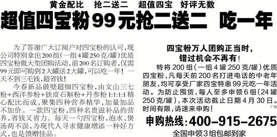 特将200组(一组4罐250克/罐)优质四宝粉,凡每天前200名打进电话的中老年朋友,均可享受厂家四宝特惠99元吃一年活动。为防止囤货,每人至多申领6组(24罐250克/罐),本次活动截止日期4月30日。时间有限,请速来申购!