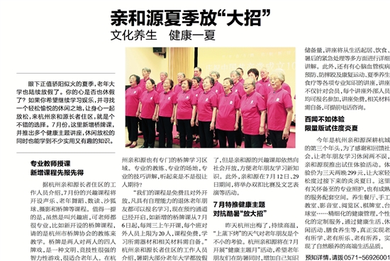 昨天杭州出梅了,持续高温,“上蒸下烤”的天气对老年朋友是个不小的考验。杭州亲和源将在7月开展“健康主题月”活动,希望老年朋友们在防暑同时,增加自己知识储备量,讲座将从生活起居、饮食、暑后的紧急处理等多方面进行详细讲解。此外,还有有心脑血管疾病预防、防摔跤及康复运动、夏季养生食疗等各项专业知识的讲座,讲座不仅针对会员,每个讲座外部人员均可报名参加,讲座免费,相关材料需自备,可提前电话咨询。