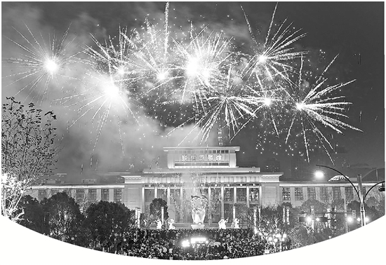除夕夜,美丽的烟花在杭州武林广场上空璀璨绽放。徐彦 摄