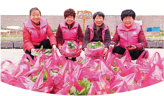 巾帼志愿者将亲手种的小青菜送给社区高龄老人。