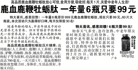 特大喜讯,感恩回馈!一年量6瓶原价999元鹿血鹿鞭牡蛎肽,现在只要99元,60片大瓶装,本次活动只为赢得好口碑,每天仅限前30名!