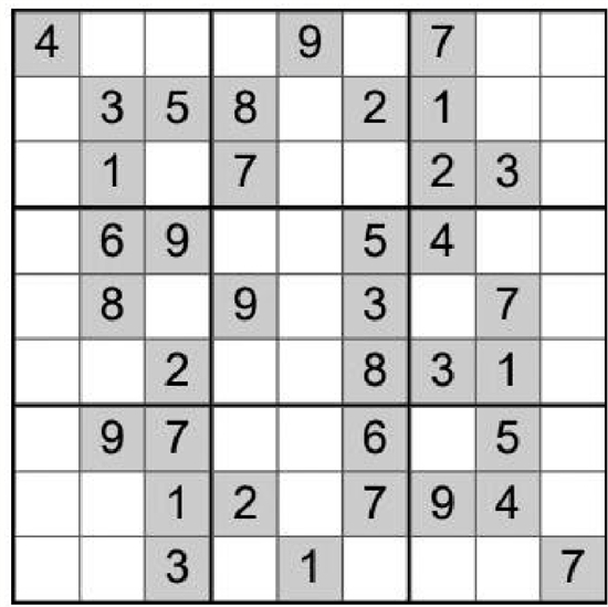 在空白格填入数字,使其每行、每列、每一个粗线格(3×3)内的数字为1-9,不重复。