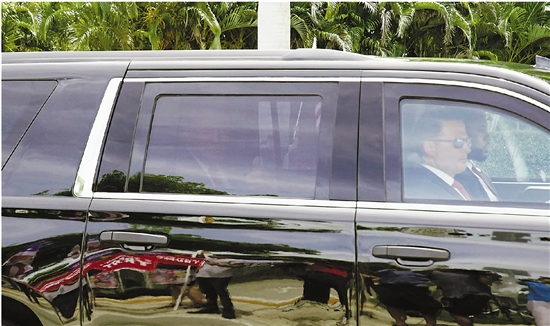 | 美国前总统特朗普13日在佛罗里达州迈阿密一家联邦法院就“密件风波”所涉37项联邦刑事指控出庭应诉。听证会上,特朗普全程沉默,未回答检方任何问题,其律师向法庭提出无罪抗辩。听证会后,特朗普被允许无条件离开法庭,无需缴纳现金保释金,也不必上交护照,其个人旅行不受限制。美国法律界人士称,即便受到刑事指控,甚至最终获罪,并不妨碍特朗普继续竞选总统。图为6月12日在美国佛罗里达州多拉尔拍摄的特朗普(左)乘坐的车辆。 新华社/美联 |
