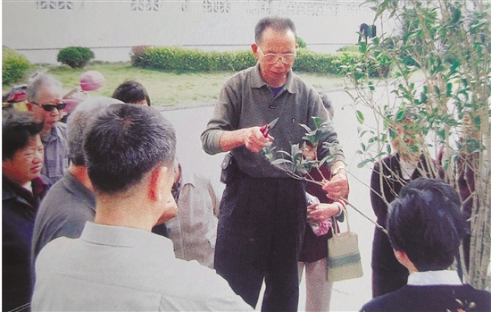 张日进给老年大学花卉班上课,指导花木整枝技术。照片摄于2004年