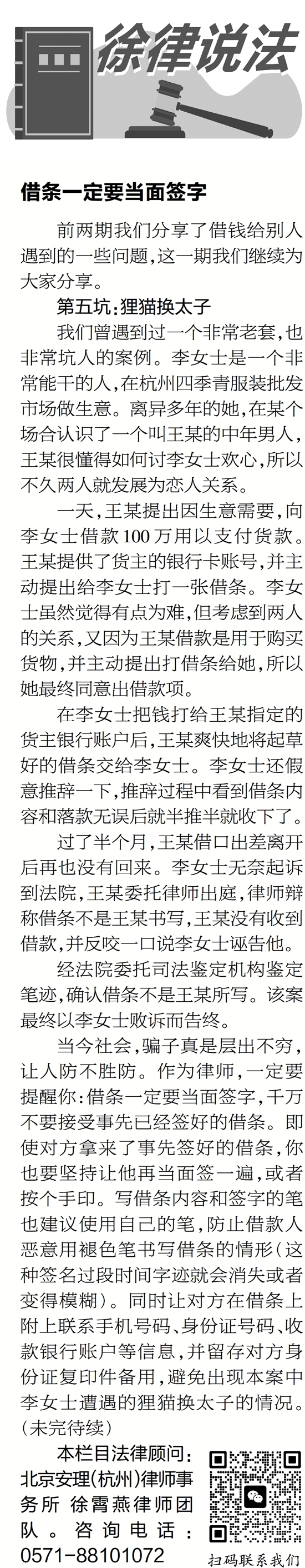 当今社会,骗子真是层出不穷,让人防不胜防。作为律师,一定要提醒你:借条一定要当面签字,千万不要接受事先已经签好的借条。即使对方拿来了事先签好的借条,你也要坚持让他再当面签一遍,或者按个手印。写借条内容和签字的笔也建议使用自己的笔,防止借款人恶意用褪色笔书写借条的情形(这种签名过段时间字迹就会消失或者变得模糊)。同时让对方在借条上附上联系手机号码、身份证号码、收款银行账户等信息,并留存对方身份证复印件备用,避免出现本案中李女士遭遇的狸猫换太子的情况。(未完待续)