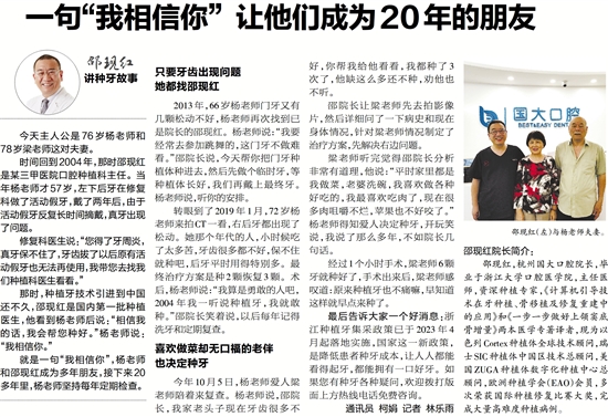 那时,种植牙技术引进到中国还不久,邵现红是国内第一批种植医生,他看到杨老师后说:“相信我的话,我会帮您种好。”杨老师说:“我相信你。”