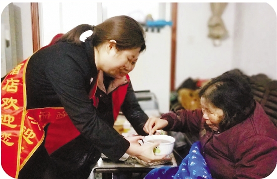 志愿者为困难老人送上热呼呼的腊八粥。