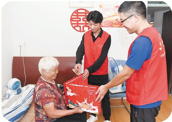 乡贤出资为老人送中秋月饼。