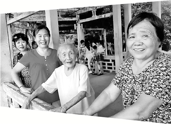 2014年8月,100岁的项彩凤(右二)在子女陪同下逛西湖。 受访者供图