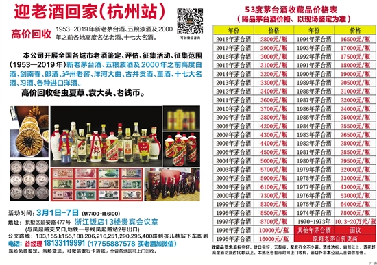 本公司开展全国各城市老酒鉴定、评估、征集活动、征集范围(1953—2019年)新老茅台酒、五粮液酒及2000年之前高度白酒、剑南春、郎酒、泸州老窖、洋河大曲、古井贡酒、董酒、十七大名酒、习酒、各种进口洋酒。