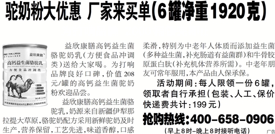 益欣康膳高钙益生菌骆驼奶乳(方便食品冲调类)送给大家喝。为打响品牌良好口碑,价值208元/罐的高钙益生菌驼奶粉欢迎品尝。