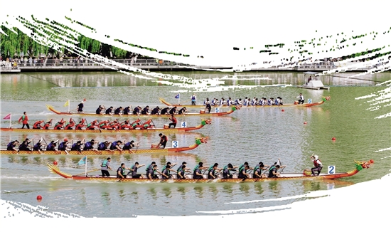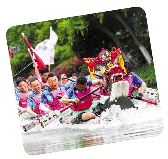 左图:同一天,杭州市西湖区在蒋村举行“奋楫正当潮 奔竞向蒋来”端午龙舟雅集活动。万众期待的满天装、半天装龙舟与赤膊龙舟纷纷亮相。
