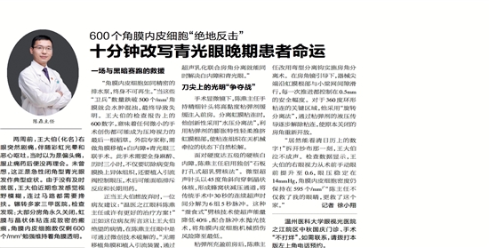 “居然能看清日历上的数字!”拆开纱布那一刻,王大伯泣不成声。检查数据显示,王大伯的右眼视力从术前手动眼前提升至0.6,眼压稳定在14mmHg,角膜内皮细胞密度仍保持在595个/mm2”“陈主任不仅救了我的眼睛,更救了这个家。” 记者 徐小翔