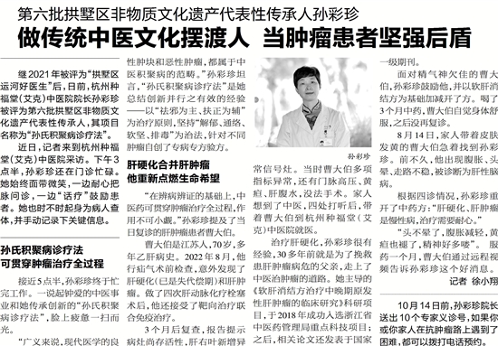 治疗肝硬化,孙彩珍很有经验,30多年前就是为了挽救患肝肿瘤病危的父亲,走上了中医治肿瘤的道路。她主导的《软肝消结方治疗中晚期原发性肝肿瘤的临床研究》科研项目,于2018年成功入选浙江省中医药管理局重点科技项目;之后,相关论文还发表于国家一级期刊。