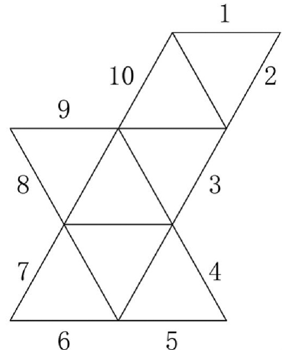 右图是一幅立体图的平面展开图,折叠后会形成一个正八面体。如3号边会和4号边相接,9号边会和10号边相接。哪一条边会与1号边相接?