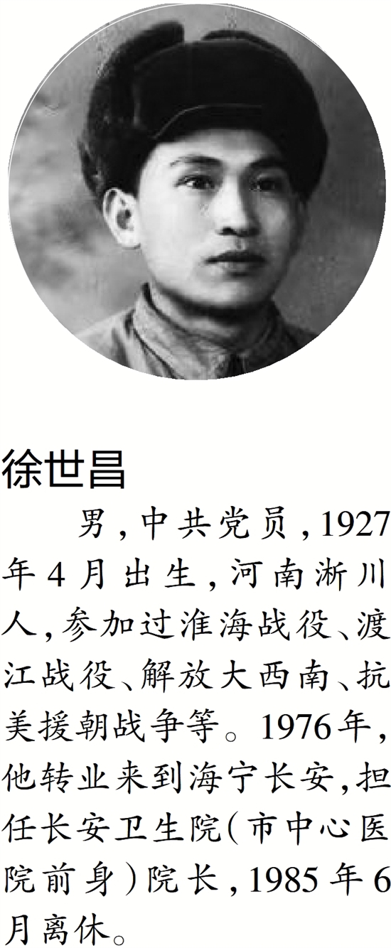 男,中共党员,1927年4月出生,河南淅川人,参加过淮海战役、渡江战役、解放大西南、抗美援朝战争等。1976年,他转业来到海宁长安,担任长安卫生院(市中心医院前身)院长,1985年6月离休。