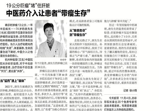 经过一年坚持服用中药调理,唐先生的复查结果带来了惊喜:肝脏肿瘤不仅没有继续增大,反而缩小了1公分,且形态从圆润的块状变得扁平,对周围脏器的压迫显著减轻。更重要的是,他的生活质量发生了翻天覆地的变化,现在已经能能自行下楼散步、买菜,甚至还积极参与了社区围棋、书法等社交活动,实现了高质量的“带瘤生存”。 孙院长强调,通过中医药的整体调理,改变肿瘤赖以生存的“内环境”,许多患者完全有可能实现与肿瘤共存,重获有质量的生活。