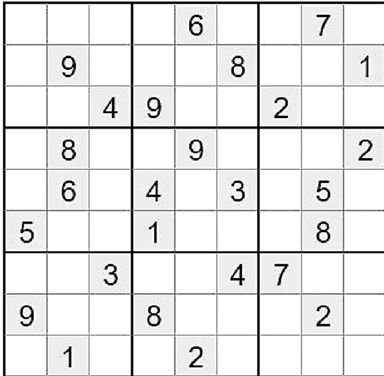 在空白格填入数字,使其每行、每列、每一个粗线格(3×3)内的数字为1-9,不重复。