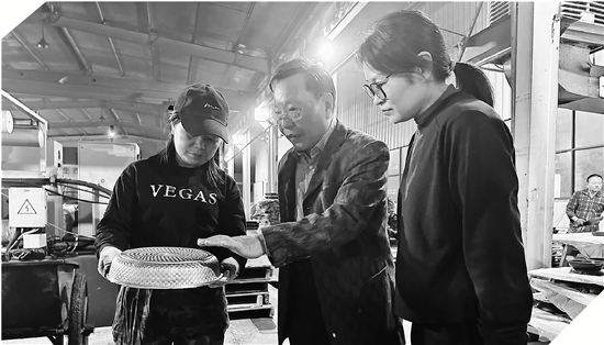 舒康颖(中)在生产车间看查看新材料制作炊具情况。包勇 摄