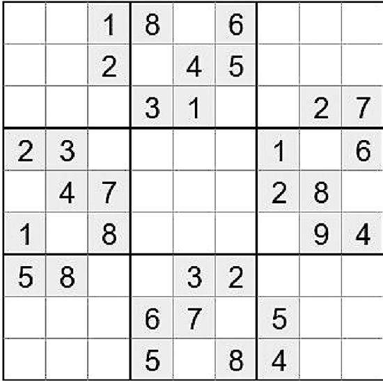 在空白格填入数字,使其每行、每列、每一个粗线格(3×3)内的数字为1-9,不重复。