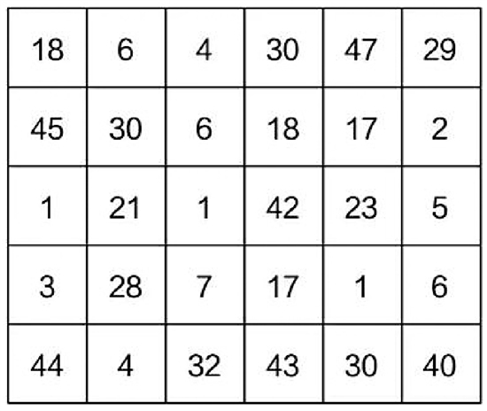 下图中的数字排列是有一定规律的,现在让你将图中的方格分成6个完全相同的部分,并且每一部分中,所有数字之和都为100,你能做到吗?