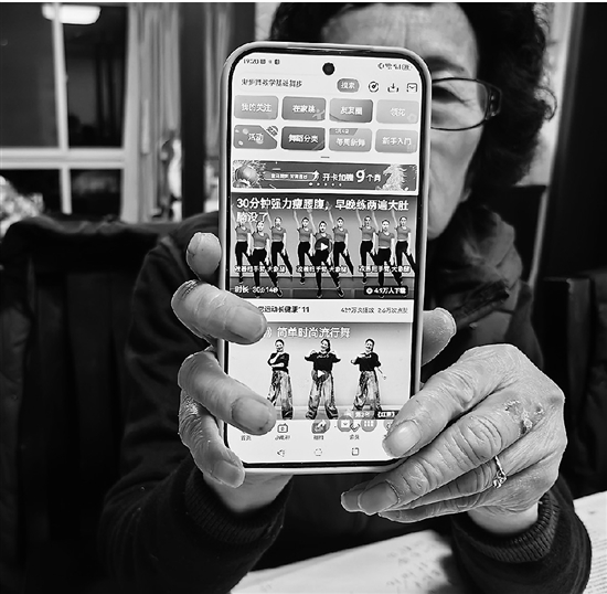 刘女士展示手机内的广场舞App,表示“用了8年没花过一分钱”。 孙磊 摄