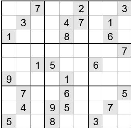 在空白格填入数字,使其每行、每列、每一个粗线格(3×3)内的数字为1-9,不重复。