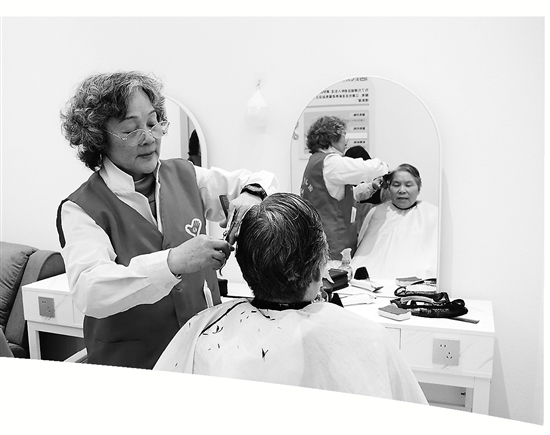 (上图右)钱塘区银发志愿者为老年居民修剪头发。