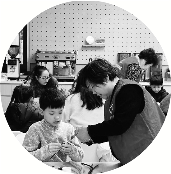 (下图)萧山区银发志愿者教小朋友做手作创作。