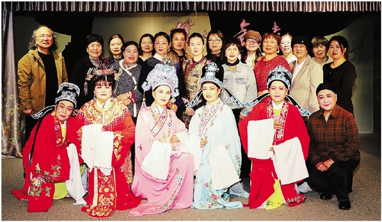 过君英(中排左五)极力为学员争取演出机会,而先生马剑(中排左一)总是全力支持妻子的公益越剧事业。 受访者供图