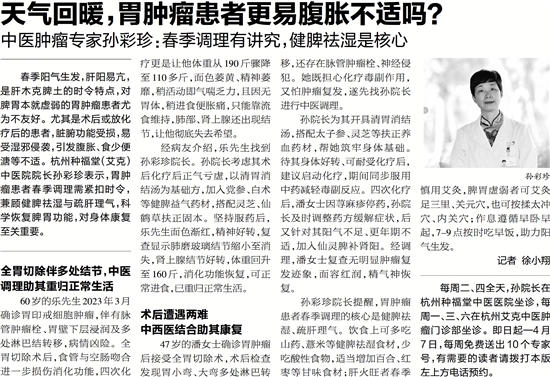 春季阳气生发,肝阳易亢,是肝木克脾土的时令特点,对脾胃本就虚弱的胃肿瘤患者尤为不友好。尤其是术后或放化疗后的患者,脏腑功能受损,易受湿邪侵袭,引发腹胀、食少便溏等不适。杭州种福堂(艾克)中医院院长孙彩珍表示,胃肿瘤患者春季调理需紧扣时令,兼顾健脾祛湿与疏肝理气,科学恢复脾胃功能,对身体康复至关重要。