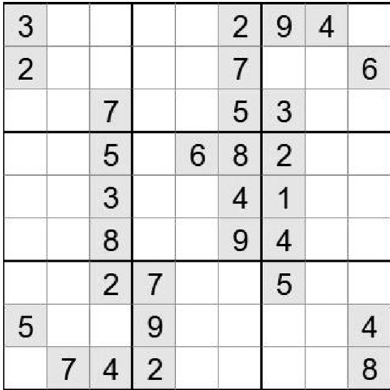 在空白格填入数字,使其每行、每列、每一个粗线格(3×3)内的数字为1-9,不重复。