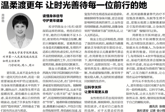 陈女士的遭遇,并非个例。西湖大学医学院附属杭州市第一人民医院城北院区妇科周群艳主任医师告诉记者,在门诊中有太多被更年期困扰的女性。她解释道,更年期的种种不适,从来不是单纯的“心情不好”或“身体变老”,而是围绝经期低雌激素状态在“作怪”。随着卵巢功能慢慢衰退,雌激素分泌减少,不仅会引发血管收缩异常、骨质疏松加速、反复发作的生殖道及泌尿道感染、睡眠障碍等身体问题,更会直接影响神经系统的调节,让女性变得情绪敏感、焦虑抑郁,就像身体里的“情绪调节器”突然失灵,让人无所适从。