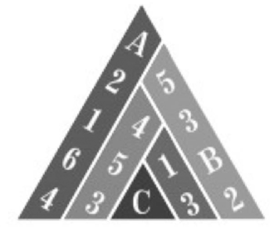 仔细观察这五列不同数字排列组成的金字塔,你能否通过观察金字塔中数字的摆放规律,求出A、B、C的值。