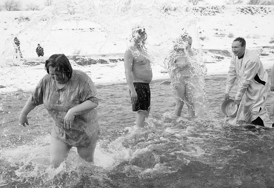 1月19日,在吉尔吉斯斯坦一村庄,一名东正教牧师用卡拉巴尔塔河冰冷的河水为一位女子洗礼。根据东正教的传统,每年的1月19日是主显节。人们相信,这一天在河水中沐浴可以带来健康。