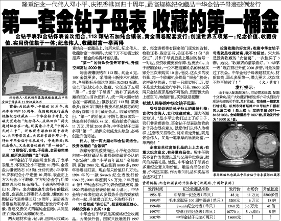 背景:为纪念邓小平逝世10周年、庆祝香港回归10周年,我国破例发行最高规格纪念收藏品——中华金钻子母表,它破天荒地把“纪念伟人、庆祝回归”两大题材融合在一起,既寓意小平是“中国人民的儿子”,还体现香港和祖国子母连心、共同繁荣昌盛。大家非常敬仰邓小平,得知中华金钻子母表发行,争先购买:既纪念伟人,又是投资收藏的“第一桶金”。