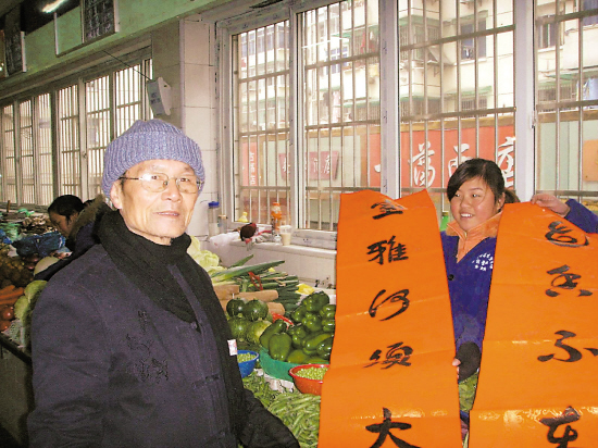 杭州古荡街道古东社区组织企退军转干部、高职人员书写春联,送给滞留在古荡农贸市场的外来民工,让他们在春节来临之际,感受到杭州人的热情。