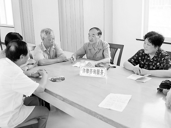图为法律咨询服务站站长郭昌金(右二)、服务站工作人员张桂好(右一)在接受社区居民咨询。