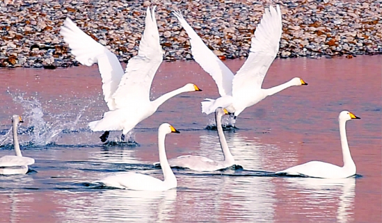 寒冬时节,位于青海省海南藏族自治州贵德县境内的黄河上游湿地区成为大天鹅的“乐园”,它们翔集于碧水丹山之间,为冬日沉寂的雪域高原带来生机与活力。 侯德强 摄