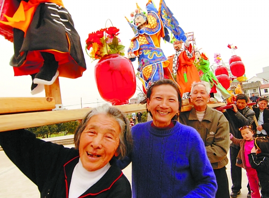 日前,义乌市廿三里街道王店村举行元宵灯会,村民们把栩栩如生的水浒“梁山一百零八将”搬上元宵板凳龙。这不,80岁的阿婆虞庭球(前),也兴冲冲把家里有4个水浒人物的两片板凳龙搬来接上。